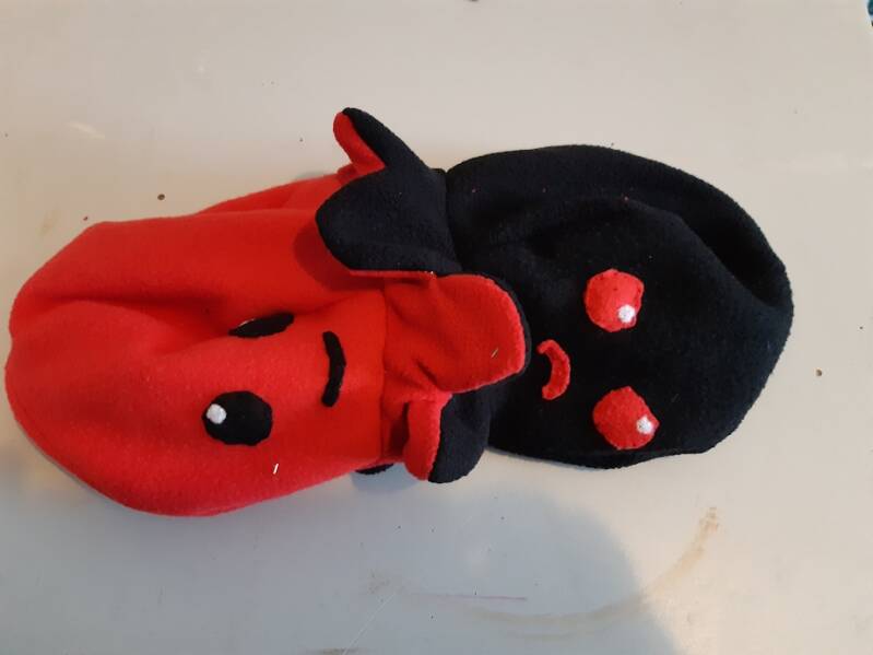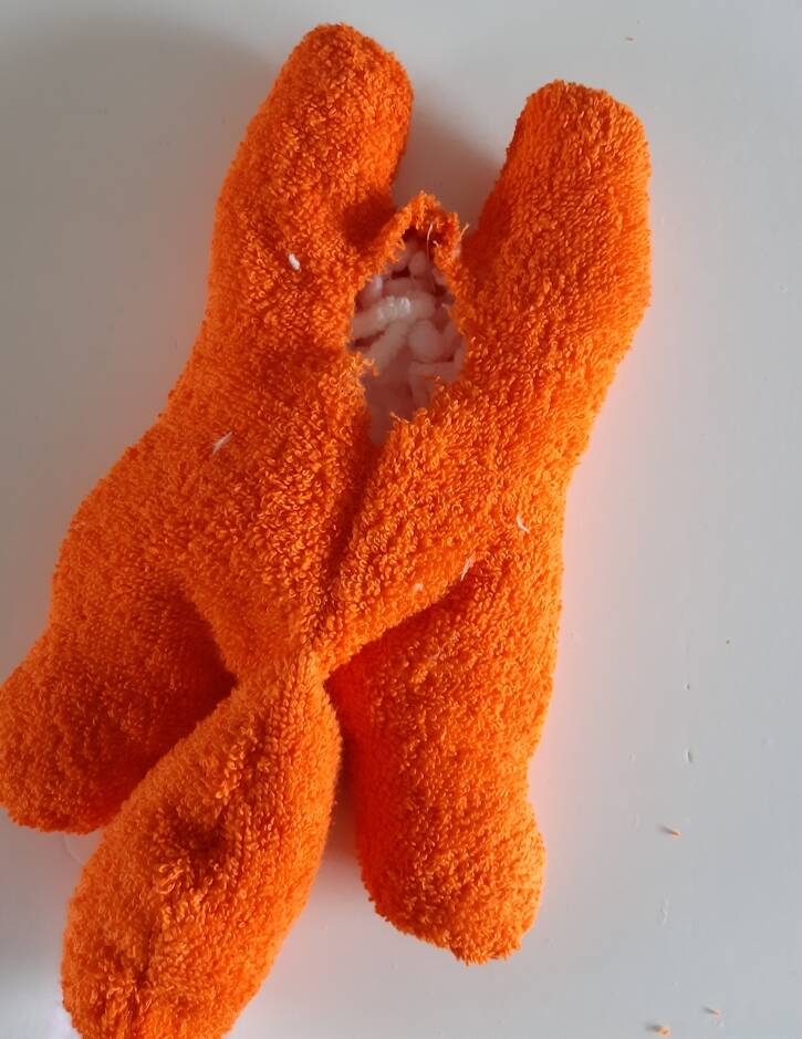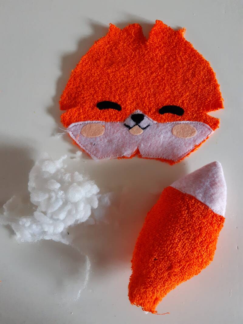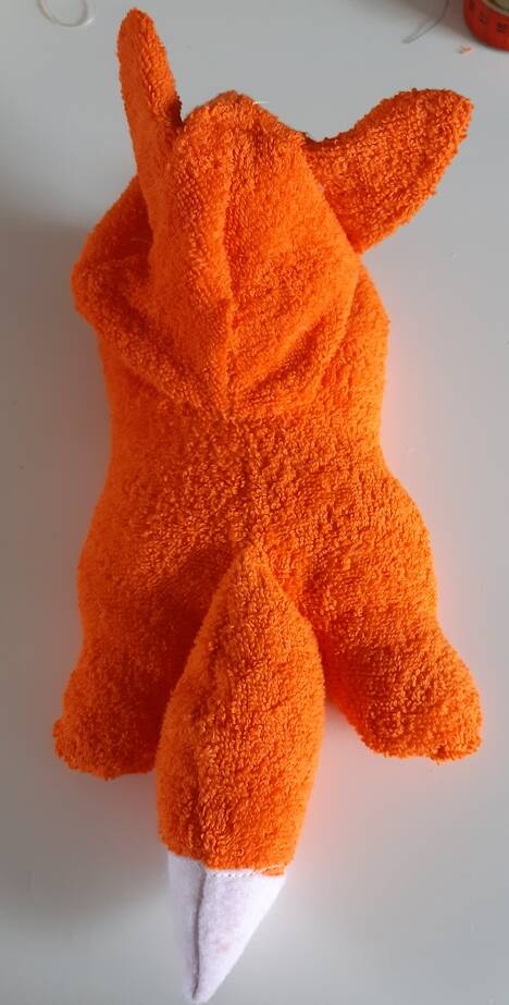 Binnestebuiten draaien hoofdje erop naaien (zal met de hand moeten ) vul het hoofdje verder op eventueel het lijfje ook nog maak het hoofdje aan de achterkant dicht. klaar is het vosje