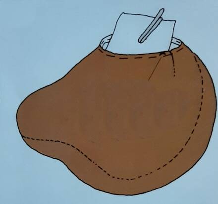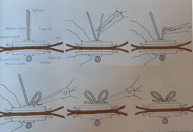 ene helft van het schanier door de stof prikken ,let wel op dat het een gaatje is waar de splitpen doorgaat het kruisje op de tekening en patroon. Dan een lapje ,