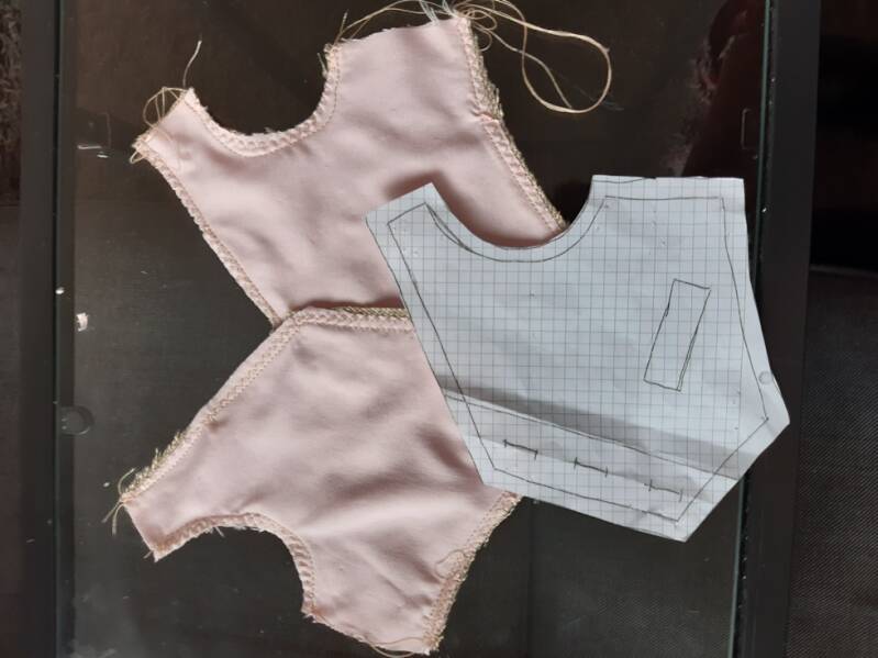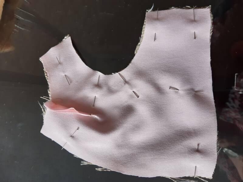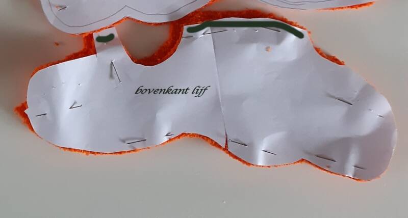 nu heb je de onderdelen klaar en kun je met het lijf beginnen kijk goed waar alle openingen zitten en zijn aangegeven . goede kant van de stof op elkaar leggen en vastnaaien