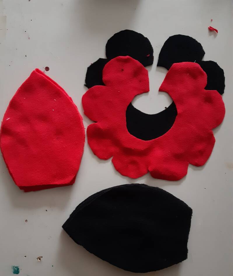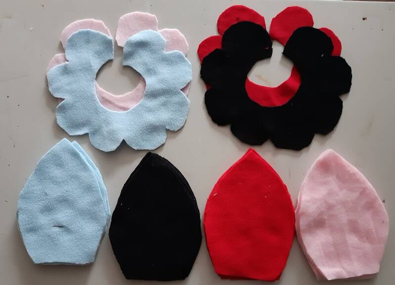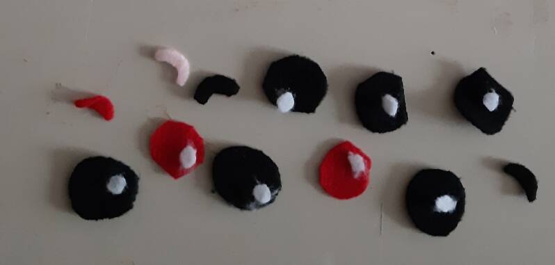 Knip eerst het patroon uit , en daarna alles op stof (vilt) leggen en uitknippen. Als eerste maak je het gezicht,