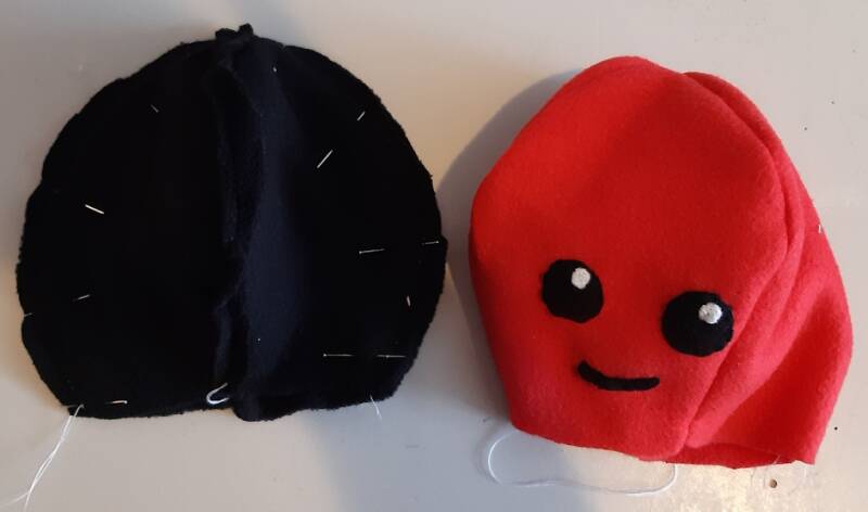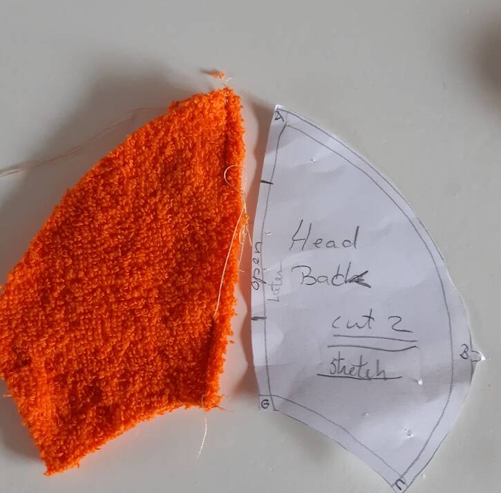 oogjes en mondjes uitknippen en op een gedeelte van de kop vastzetten. Leg de goede kanten van de kopdelen op elkaar en naai ze vast.