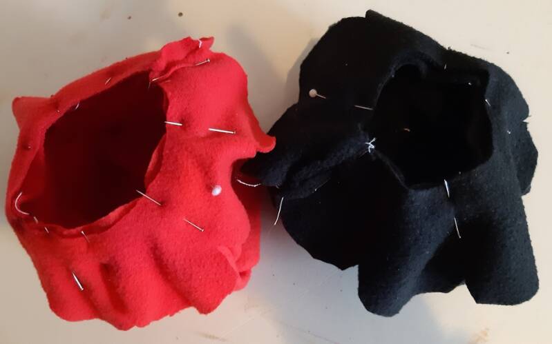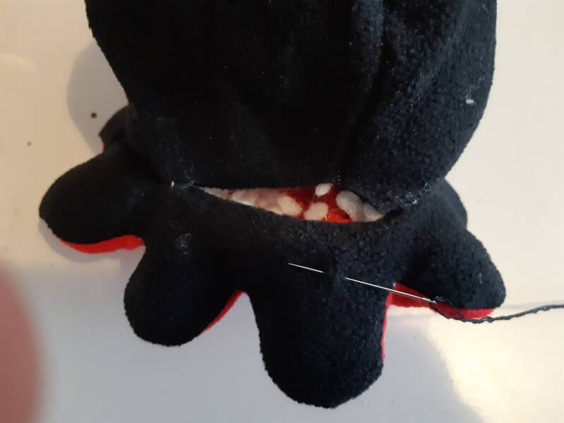 Als alle delen aan elkaar zitten kunnen de tentakels eraan .dus leg weer de goede kanten op elkaar en naai ze aan elkaar. Maar laat een opening open voor het keren later.