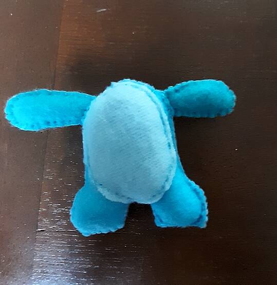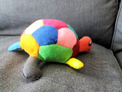 Pootjes en kopje en staartje in elkaar zetten en opvullen. Zet ze aan de onderkant van de schildpad vast Onderkant en schild op elkaar leggen met de goede kanten op elkaar vouw eerst de pootjes en kop en staart naar binnen ,laat een stuk open om te draaien en op te vullen. na het opvullen de opening sluiten en klaar.