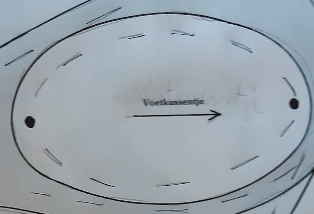 opbouw van het schanier: eerst de splitpen daarna een ring of metelen plaatje , dan een houten schijfje ,lapje vilt of leer . dan stop je het b.v. in een poot laat de splitpen tegen elkaar zitten zodat het uit één gaatje komt .De poot moet in het gaatje (dat je moet maken )dat is aangegeven op het lijfpatroon door een kruisje.