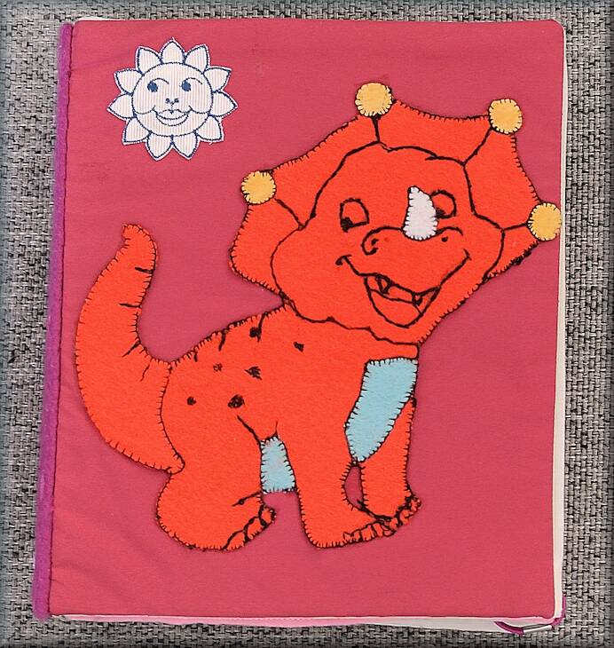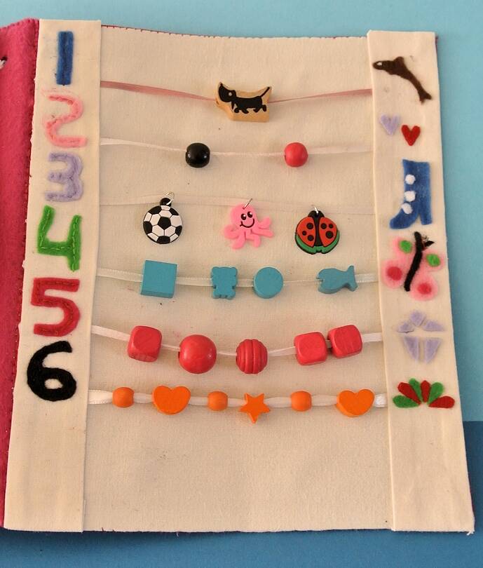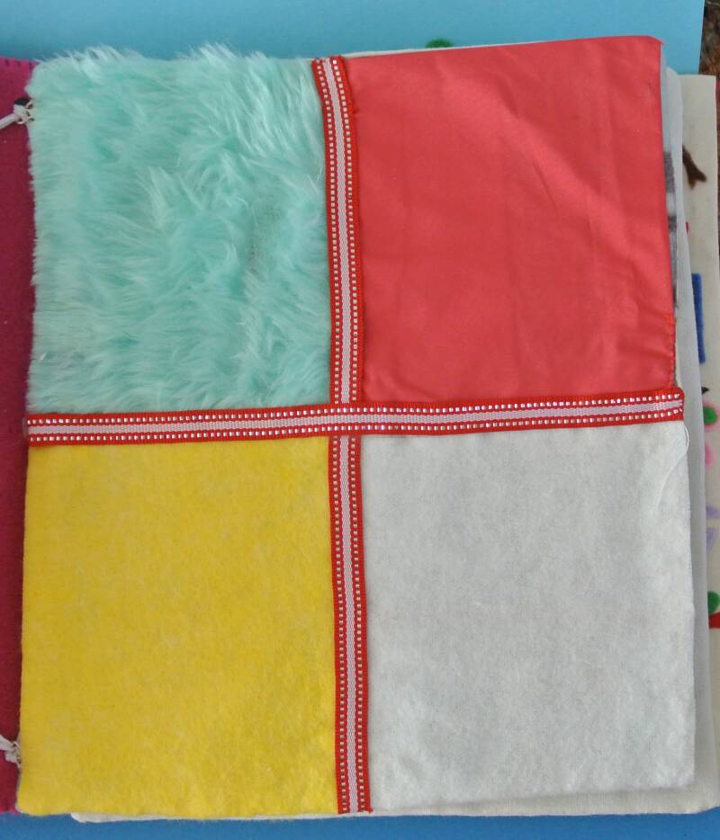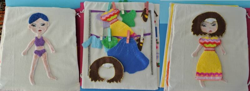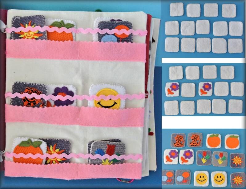 Als we de pagina omslaan zien we figuren die bij elkaar passen. Vilt plakt normaal gesproken op elkaar , maar om wat extra vastheid te krijgen heb ik een stukje klittenband op de figuren van het boek geplakt.