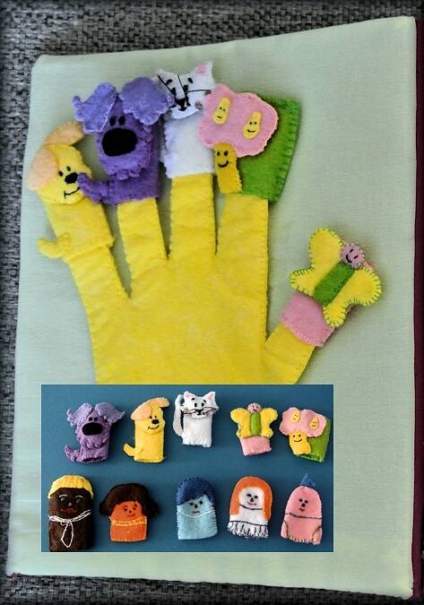 Op de eerste pagina vind je poppetjes die je op je vingers kunt steken Ik heb hier twee soorten gemaakt. De welbekende mama vinger , papa vinger, zusje vinger ,broertje vinger, baby vinger Voor de andere hand figuren uit de serie van Woezel en Pip.